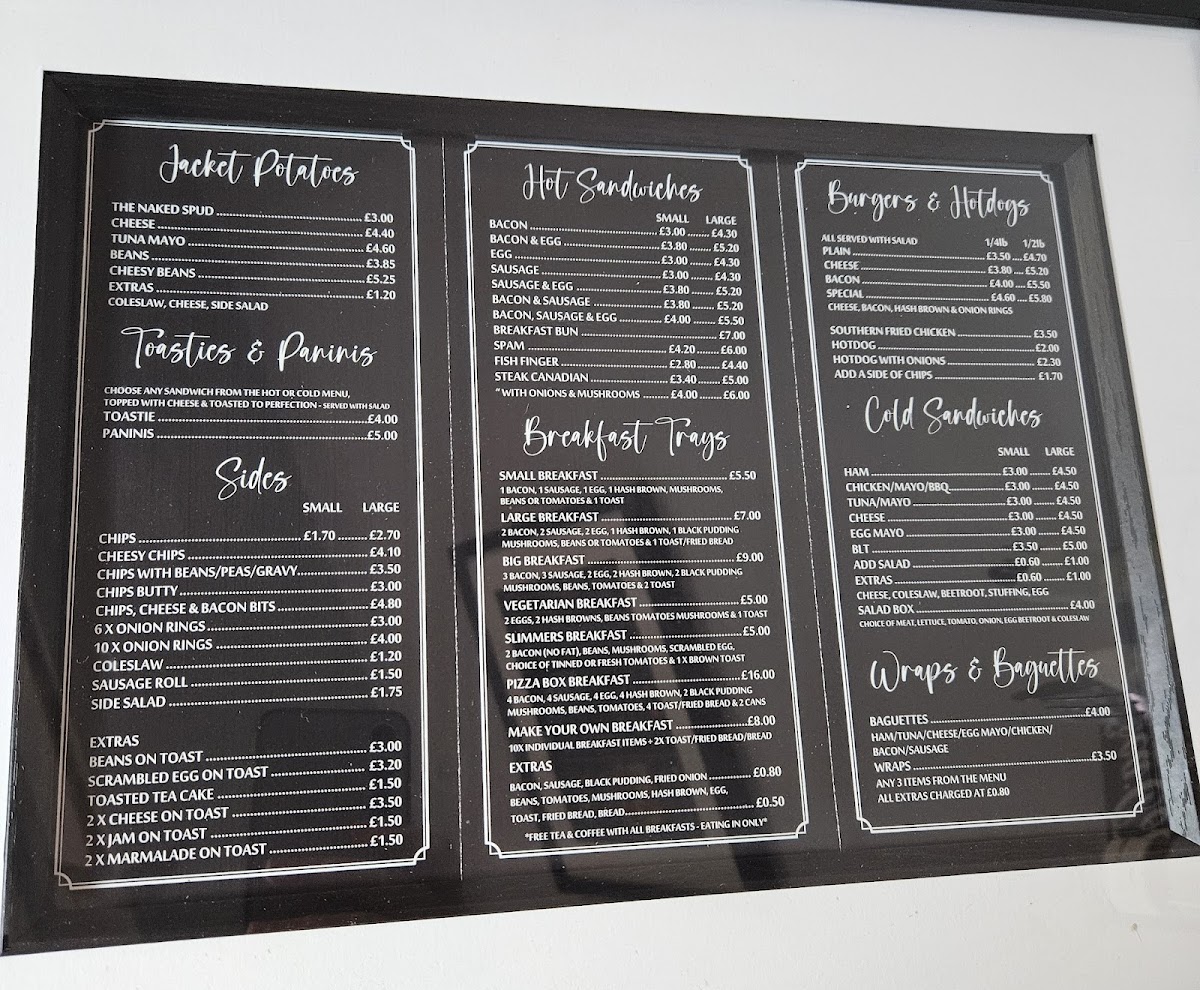 - Jacket Potatoes: Choose from simple yet satisfying options like The Naked Spud (£3.00) or Tuna Mayo (£4.60), perfect for a quick bite.